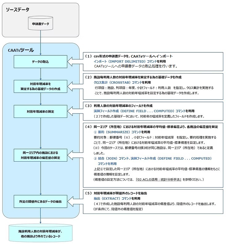 実際の監査では、今回ご紹介した利用人数の対前年増減率のみならず、他の項目でも比較・分析を行い、多くの項目で閾値外となった施設を特定することで、監査対象案件の絞込みに成功しました。